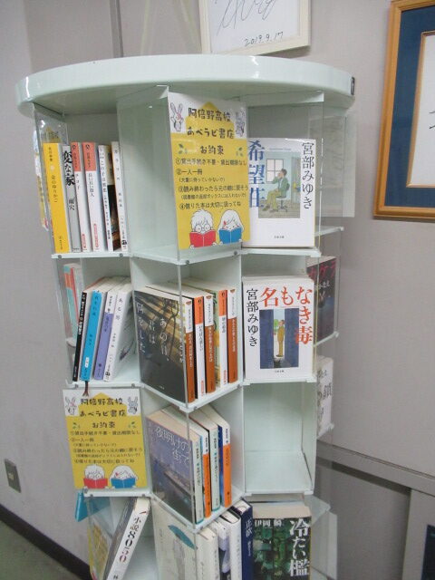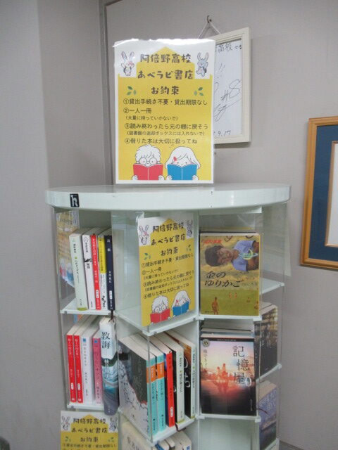 本日より「アベラビ書店」がオープンしました。アベラビ書店は、貸出し手続きが不要。貸出期限なしで、読み終わったら元の棚に戻してもらうだけ。約束は、借りた本を大切に扱うだけです。今回は教頭先生がたくさんの本を提供してくださいました。これからも先生方や生徒のみなさんの家で眠っている本があれば提供してもらい、読み合いましょうというものです。