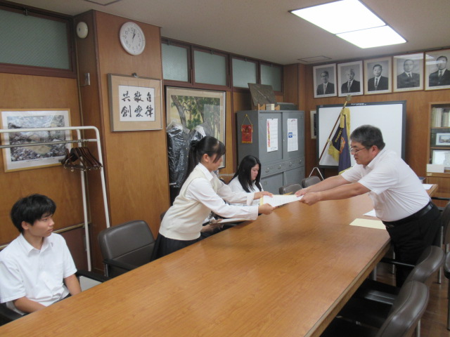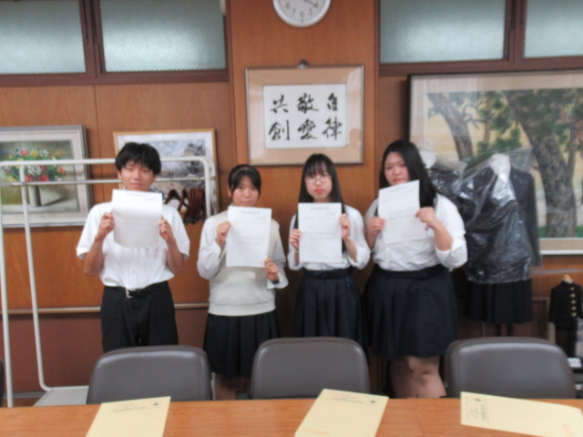 現在開催中の大阪・関西万博のアシスタントスタッフとして、この夏に府立学校の高校生50名が自主的な課外活動として取り組んだ「高校生万博チーム」に、本校から4名の生徒(3年生野本陽菜多、酒崎愛鈴、2年生村上果穂、1年生梶原夢永)が参加しました。先日、大阪府教育委員会の水野達朗教育長より活動実績証明書が交付されましたので、本日昼休みに校長より手渡しました。