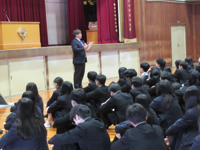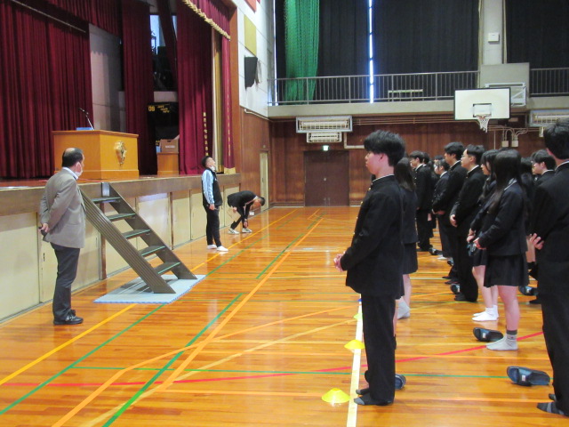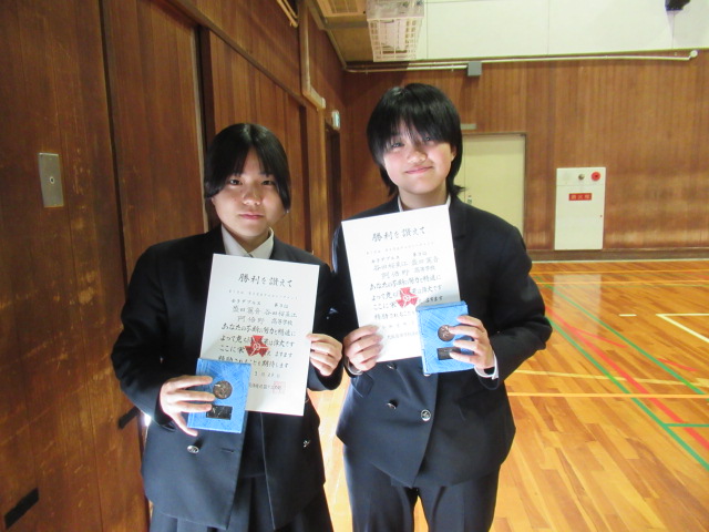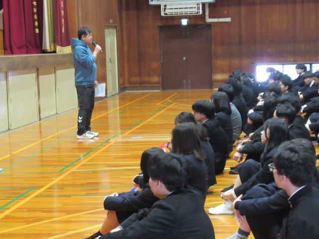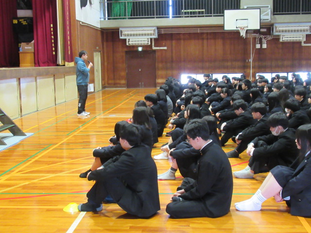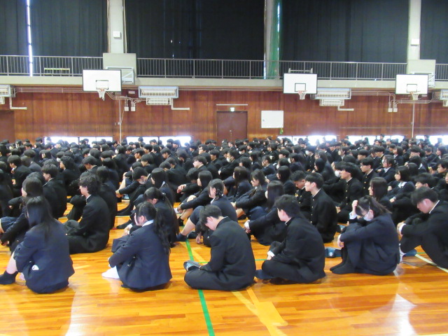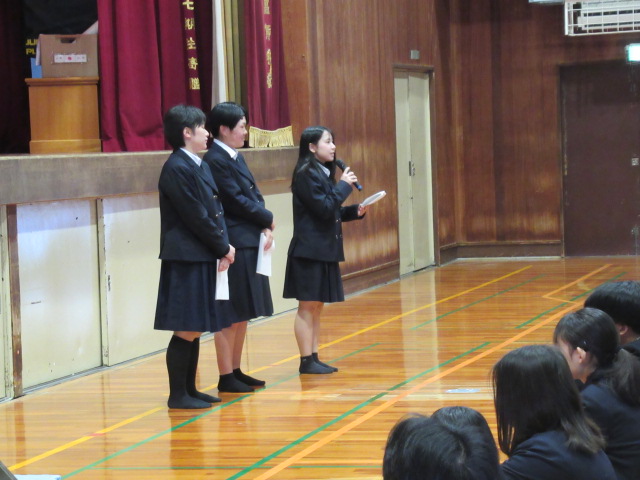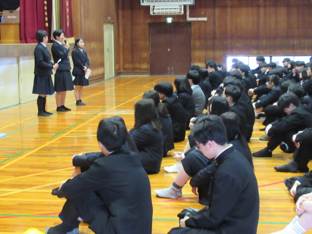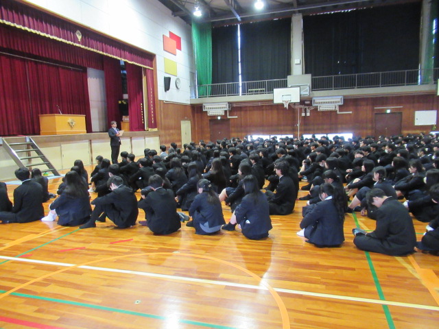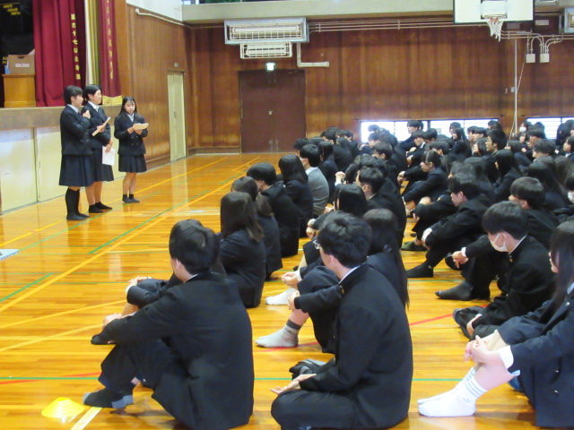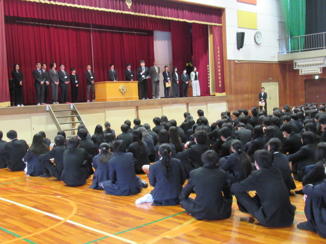 始業式では、校歌斉唱、学校長訓話、生徒表彰、生徒指導部長の話し、自治会部長の話しがありました。生徒表彰では、硬式テニス部が第19回第3学区テニストーナメント女子ダブルス第3位(盛田麗音、谷田桜菜江ペア)の表彰を受けました。