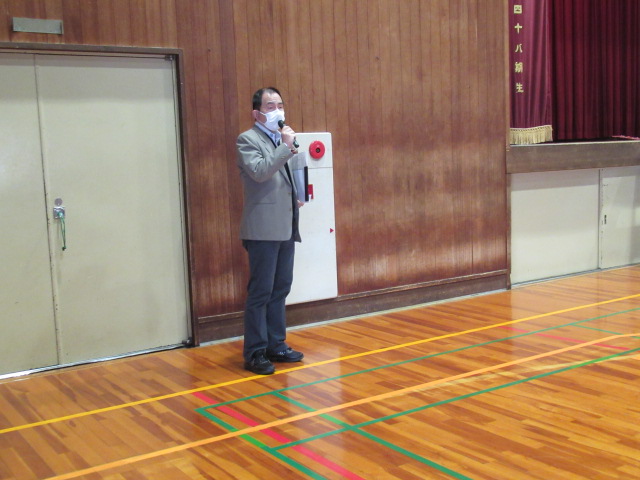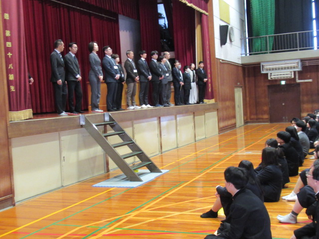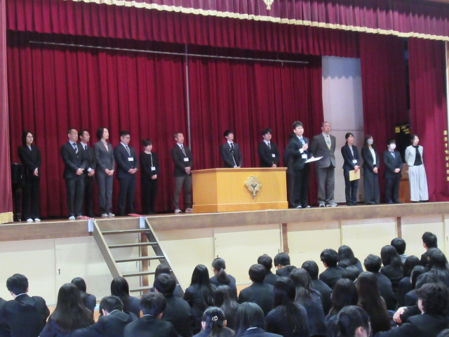 引き続いて、4月より新しく本校へ着任された先生方の着任式を行いました。今回は17名の先生方をお迎えし、舞台にたくさんの先生方が並び、校長より一人ずつ紹介がありました。代表して教頭先生から代表の挨拶をいただきました。