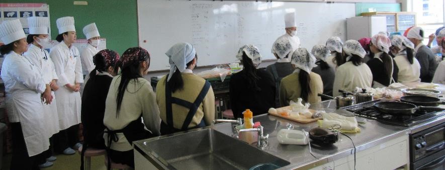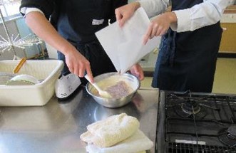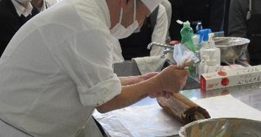 12月18日(木)2年選択科目「フードデザイン」の授業でクリスマス特別企画として『ブッシュドノエル』の調理実習をおこないました。今回は、大阪調理製菓専門学校ecoleUMEDAより先生を招聘しての実習です。