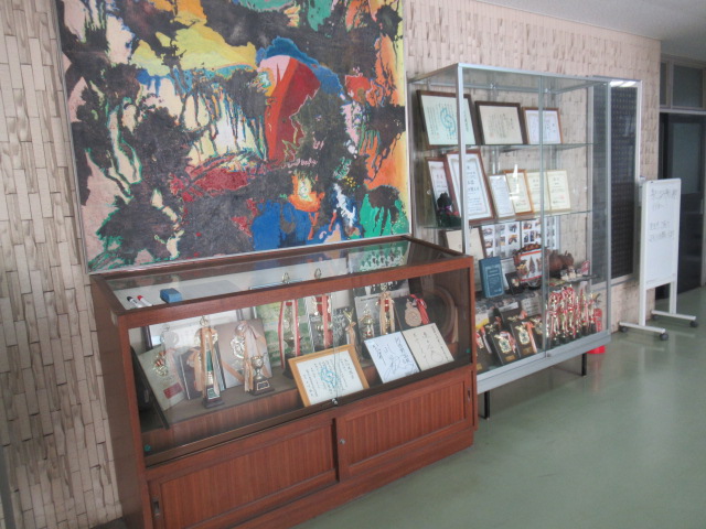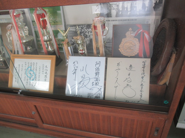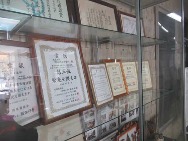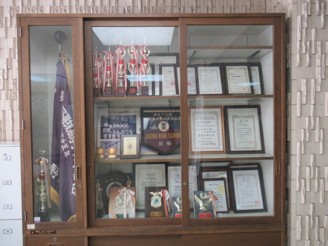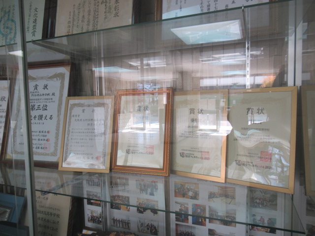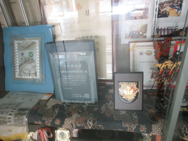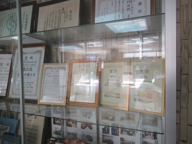 1階玄関にある表彰状の陳列ケースを綺麗にしました。部活動などで過去にいただいた賞状などを飾っていますが、汚れていたので綺麗にしました。軽音エレキ部やダンス部など最近全国大会や近畿大会、大阪府大会で入賞したものも少し加えました。これからもたくさん飾りたいと思いますので、部活動や授業での取り組みを頑張ってほしいと思います。