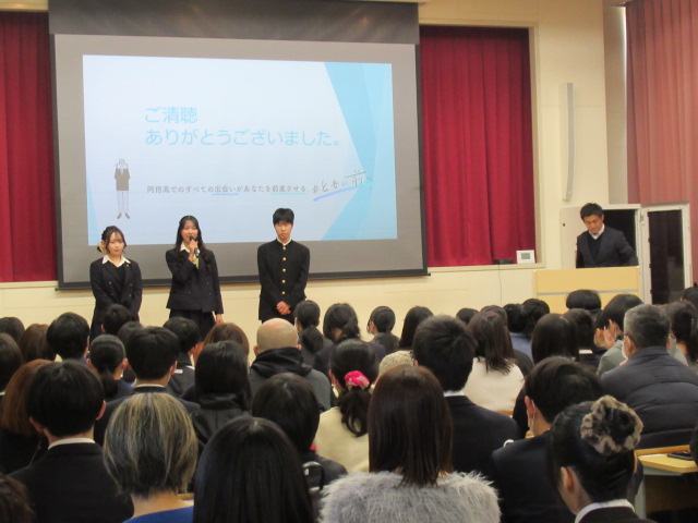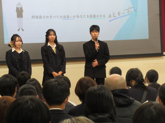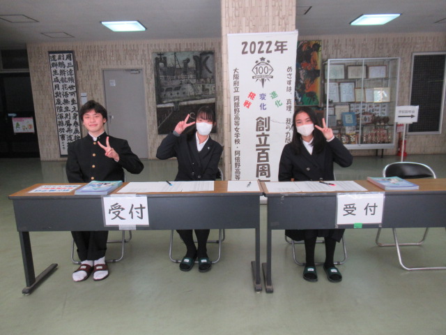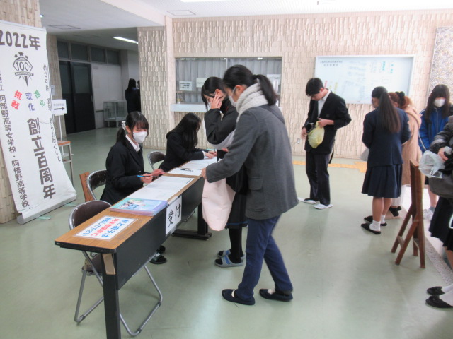 説明会では司会係の進行で、校長挨拶、学校紹介、阿倍高生へのインタビューやメッセージ、少人数のグループに分かれての校内見学ツアー、質疑応答や個別相談を行いました。今年度の最後の学校説明会ということもあり、たくさんの中学生や保護者の方々に参加いただきました。