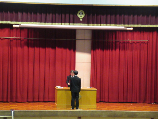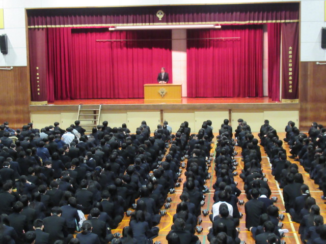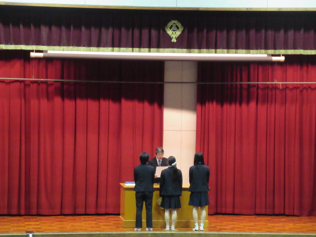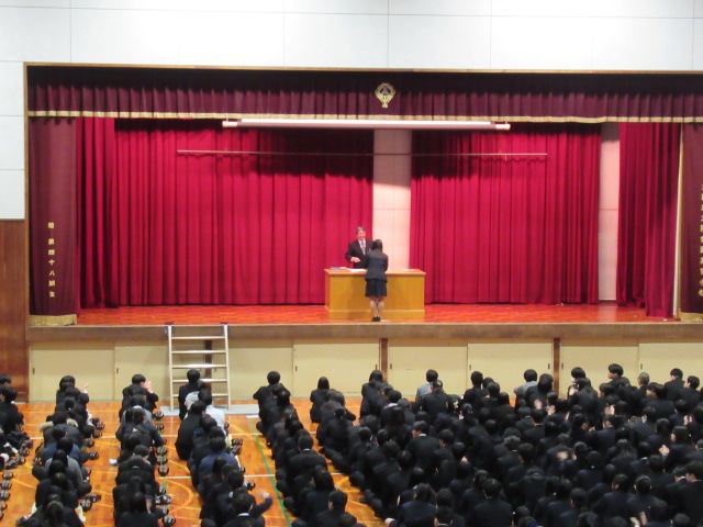 12月24日(水)1・2限の授業後、3限より大掃除、終業式を体育館にて実施しました。集合係の誘導で全学年が体育館に移動し、校歌斉唱、校長講話、生徒指導部長話し、進路指導部長話しが行われました。その後、2学期に部活動や授業で表彰を受けた取り組みの表彰式が行われました。