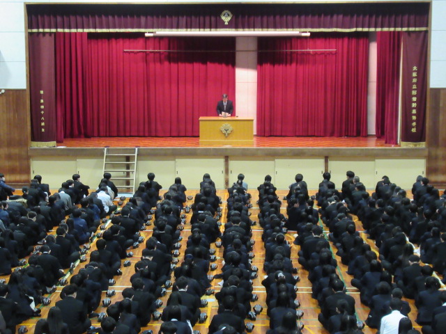 12月24日(水)1・2限の授業後、3限より大掃除、終業式を体育館にて実施しました。集合係の誘導で全学年が体育館に移動し、校歌斉唱、校長講話、生徒指導部長話し、進路指導部長話しが行われました。その後、2学期に部活動や授業で表彰を受けた取り組みの表彰式が行われました。