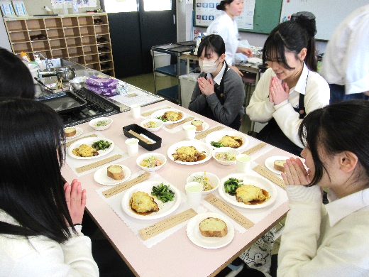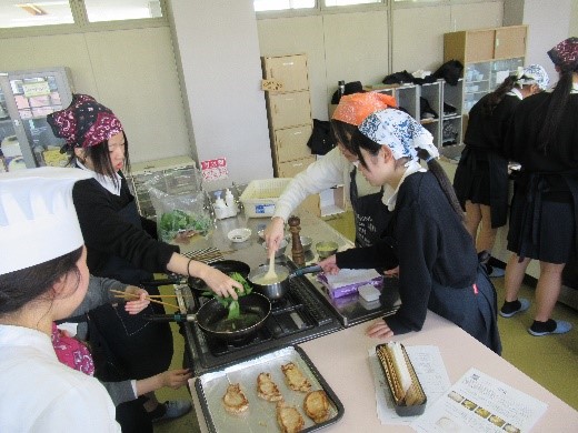 自分たちで作ったベシャメルソースが、自分たちの手で「豚肉のステーキグラタン」になっていくのを見て、生徒も楽しそうでした。 完成した逸品を皆おいしそうに頬張っていました。