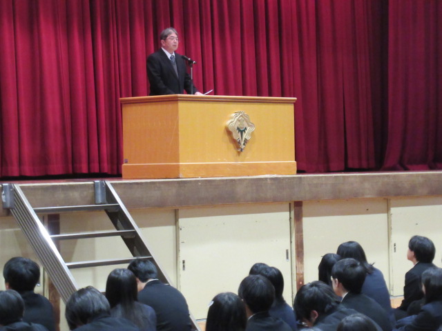 集合係の先生の指示で整列し、進行係の先生より校歌斉唱、校長講話、生活指導部長話し、進路指導部長話しが行われました。生徒たちは久しぶりの登校ですが、先生方の話しを真剣に聞いていました。