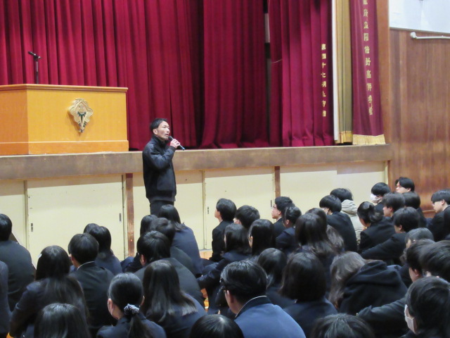 その後、部活動表彰が行われ、軽音エレキ部が12月24日に出場した高等学校芸術文化連盟主催ウインターフェスティバル2025で優秀賞入賞の表彰授与、水泳部が近畿新人大会 女子50m自由形で3位入賞の紹介が行われました。2限からは教室に戻り、3学期の授業開始となりました。