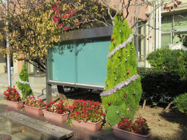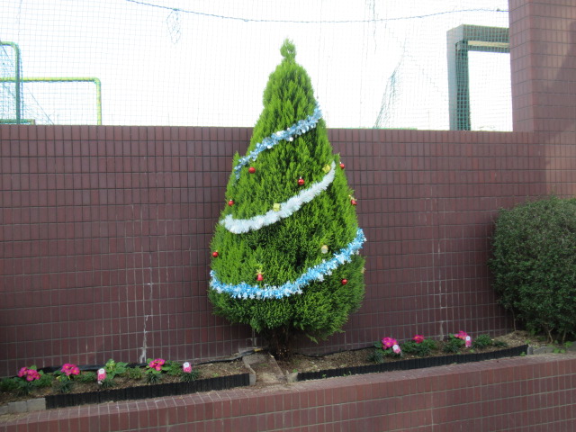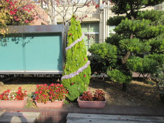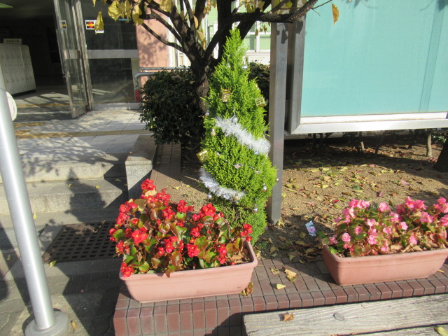 玄関や正門前の木に飾り付けがされています。PTAの方からの生徒の皆さんへの素敵なプレゼントです。夕方以降、暗くなるとライトアップするそうですので鑑賞してみてください。