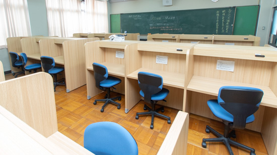 本校の学習に関する取り組みや進学実績が認められ、教育庁の補助により設置されました。平日、下校時刻まで開放しており、整った環境の下で多くの生徒が机に向かっています。